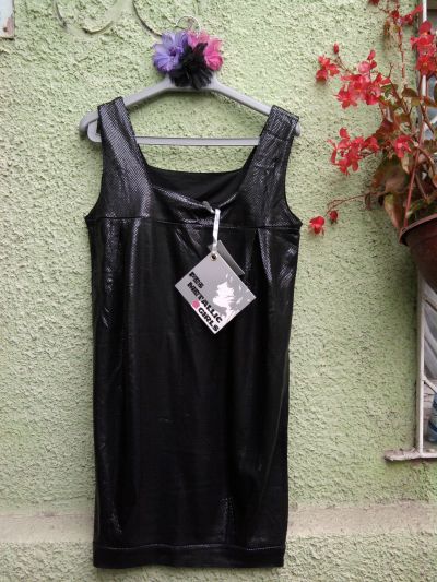 Vestido cortito de fiesta, color negro, la tela brilla, marca FES, talla S pero puede servir para una M chica. La parte de abajo es tipo globo pero no tan globo y se puede alargar, esta nuevo, lo compre y nunca lo use, viene con la etiqueta.
