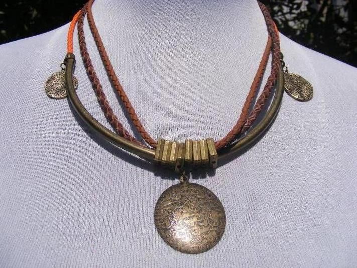Collar de cueros trenzados y lisos, separadores cuadrados y colgante de bronce envejecido.