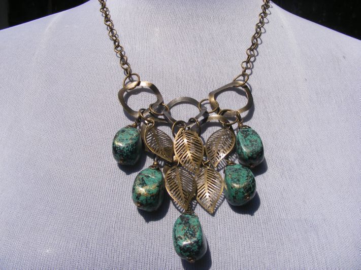 Collar argollas, hojas y cadena en bronce envejecido con acrílicos recubiertos.