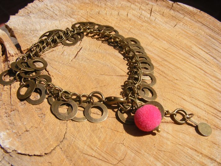 Pulsera bronce envejecido con bolita forrada en plush.