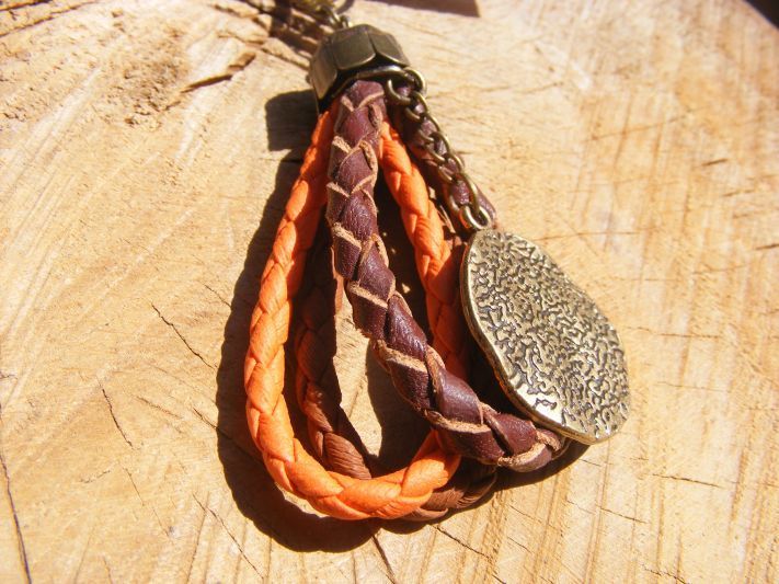 Aros de cuero trenzado, cadena, colgante y terminales en bronce envejecido.