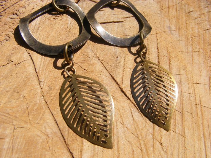 Aros argolla, hojas y cadena en bronce envejecido con acrílicos recubiertos.