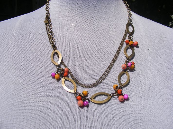 Collar argollas, hojas y cadena en bronce envejecido con perlas de vidrio en variados colores.