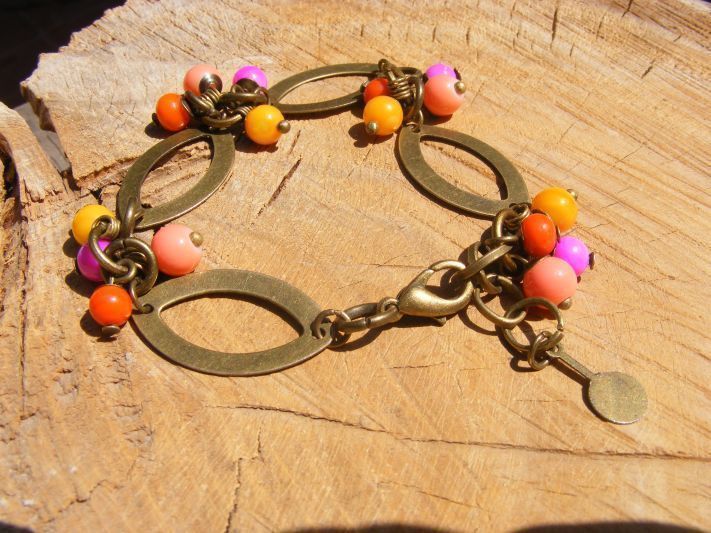 Pulsera argollas, hojas y cadenas en bronce envejecido con perlas de vidrio en variados colores