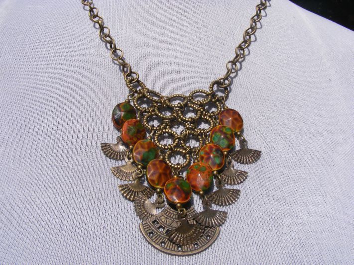 Collar argollas, abanicos y cadenas en bronce envejecido con acrílicos revestidos.