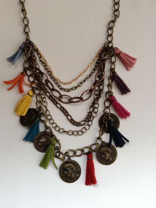 Collar diferentes cadenas con borlas de gamuza y monedas envejecidas.