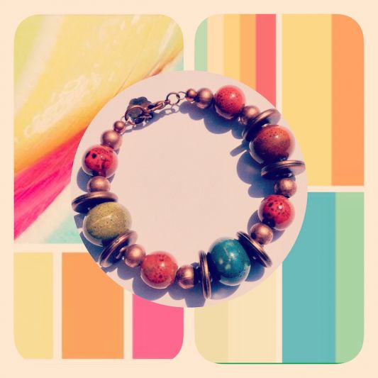 Pulseras con bolitas de porcelana en varios tamaños, perlas, separadores y terminales en cobre.