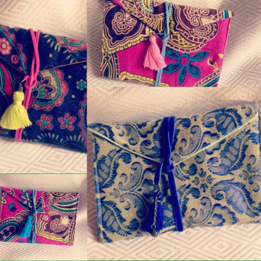 Cartera porta accesorios Vestige de tela, entretela, forro y cinta o tira de gamuza para cerrar con borla de hilo.