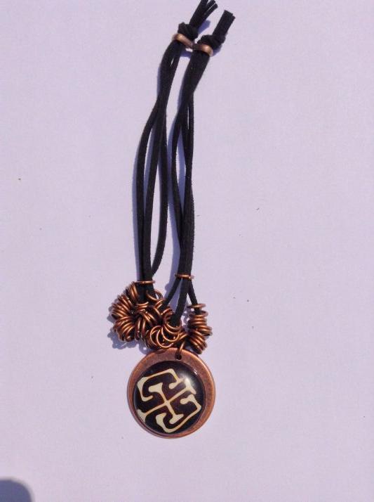 Pulsera de gamuzas negras con argollas cobre y colgante.