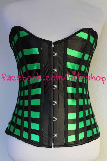 Corset Overbust satén negro con cintas verde. Frontbusk metálico al frente, Ojetillos con cintas en espalda para ajustar y REDUCIR CINTURA.