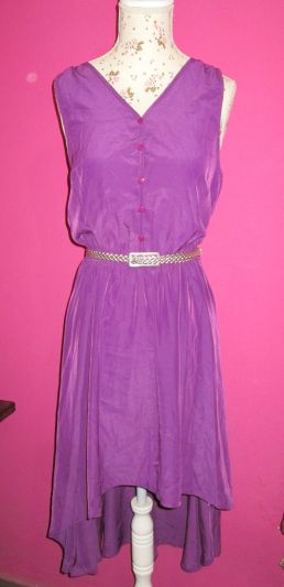 Vestido asimétrico (la parte de adelante llega a la altura de las rodillas), cintura elasticada, marca Zibel, dice talla S pero es más bien una M. Esta nuevo, con la etiqueta, me lo compre y nunca lo use.