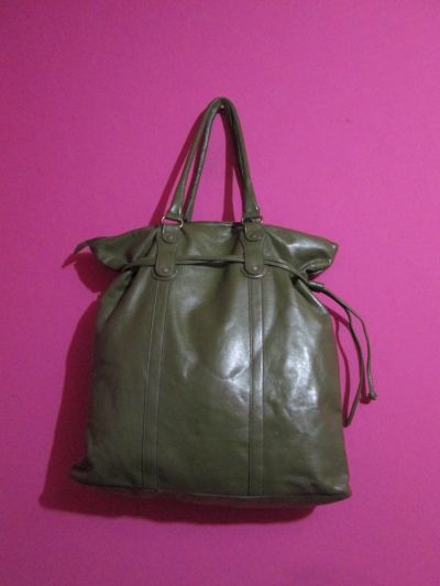 Cartera color verde, marca Aziz, cabe de todo, incluso cuadernos universitarios. Mide 40 cm de ancho y 41 cm de alto.