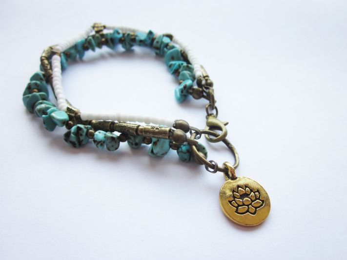Pulsera Turquesa Reconstituida , mostacillas. Medallita flor de loto