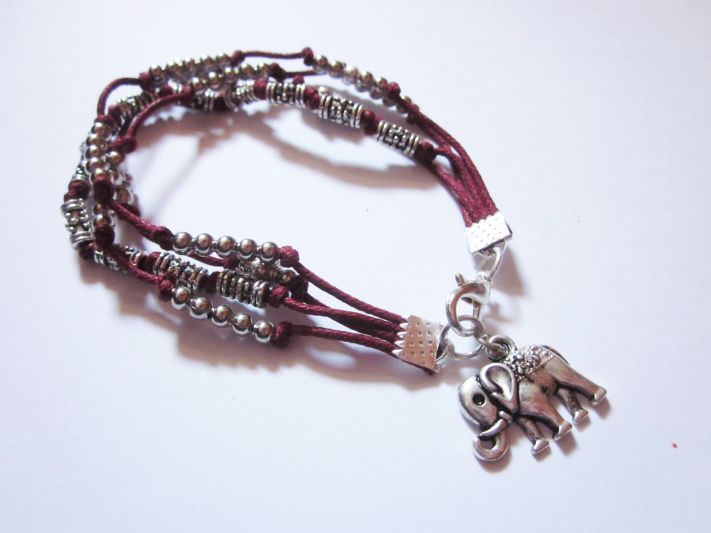 Pulsera Cordón de algodón burdeo. Mostacillas plateadas. Medallita de Elefante.
