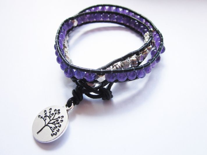 Pulsera cuero con piedras amatista entrelazados. Medallita árbol