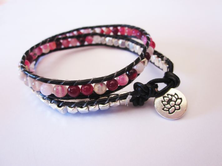 Pulsera cuero con piedras ágatas fucsia entrelazados. Medallita flor de loto