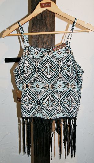 Blusa en rayón viscosa, estampada con grecas color negro y celeste, es abierta en la espalda.
