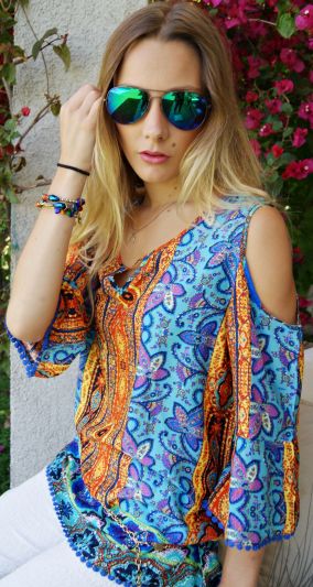 Blusa de viscosa estampada en colores hermosos, sin hombros.