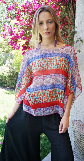 Blusa de gaza estampada de lindos colores manga murciélago.