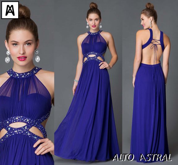 Vestido en azul purpura sin espalda,escote corazon con bordado en mosatcillas.